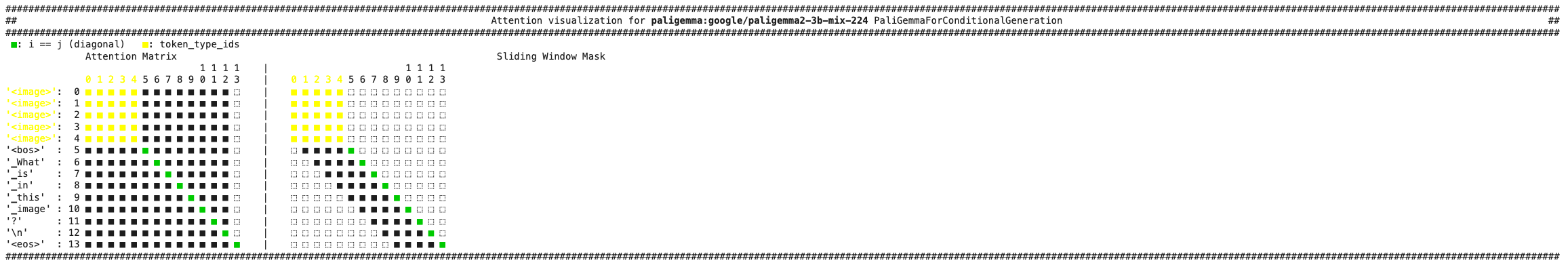 output = model.generate(**inputs, max_new_tokens=50, cache_implementation="static")print(processor.decode(output[0], skip_special_tokens=True))Use the AttentionMaskVisualizer to better understand what tokens the model can and cannot attend to.