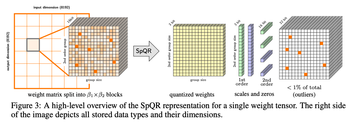 The SpQR quantization algorithm involves a 16x16 tiled bi-level group 3-bit quantization structure with sparse outliers.